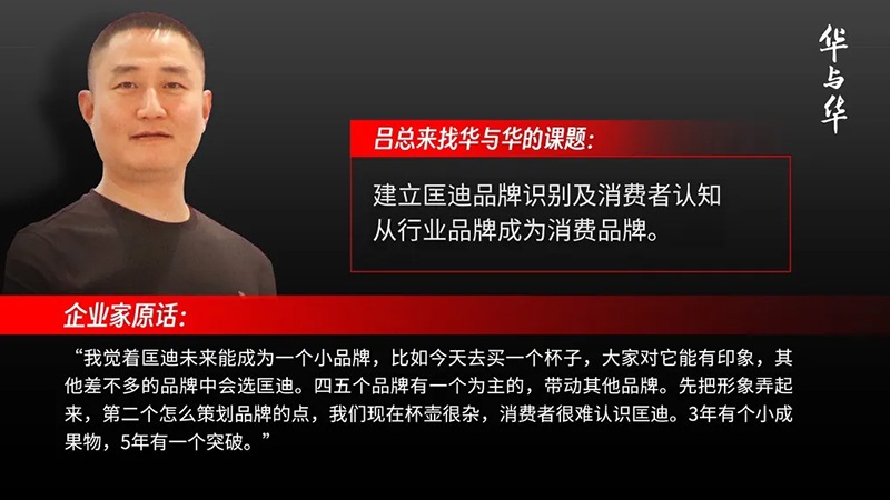 有了很雄厚的實力和很恰當的時機,呂總就希望建一個品牌,讓人能夠知道他的匡迪,希望大家今天去買一個杯子,讓大家對匡迪能有印象。所以2023年來找華與華,開啟了匡迪的品牌建設之路。